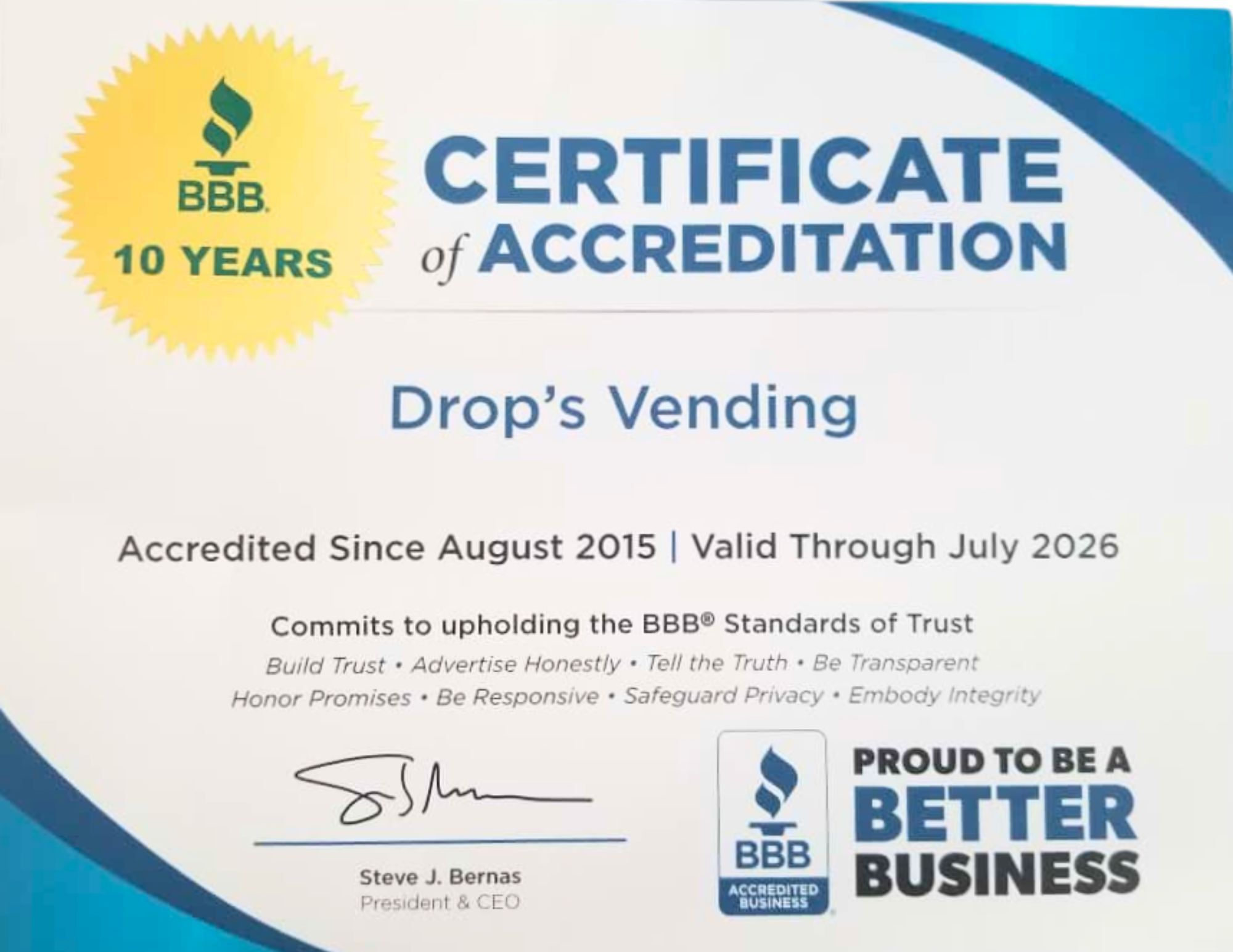 In 1982, a few short years after serving in the United States Army, Scott Drop founded Drop's Vending with one goal in mind; that goal was customer satisfaction. Drop's Vending began as a part time vending company. It quickly expanded to a full time operation that included an office coffee route and a bottled water delivery service. Over the years, Scott began looking for ways to expand the business in order to serve vending operators nationwide. He developed Drop's Vending, Inc into a highly reputable vending machine sales and refurbishing business that has stood the test of time. Scott remains dedicated and committed to customer satisfaction. That single focus, driven from every aspect of the company's operation, has brought customers back time and time again. It has been the key to his success. Scott welcomes the opportunity to speak to you personally and prove to you why you can't go wrong doing business with Drop's Vending, Inc.